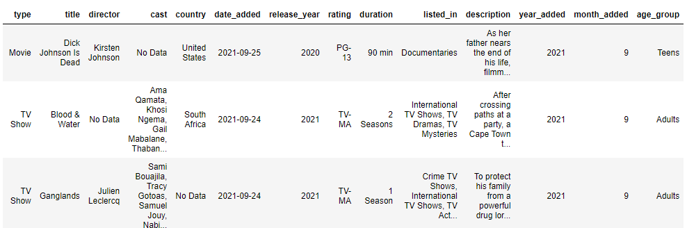 netflix['director'].replace(np.nan, 'No Data', inplace = True)