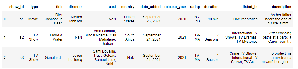 결측치(NaN)가 있는 column들을 확인할 수 있다. 동시에 날짜 column인 date_added에서 날짜 형식이 어떻게 되어 있는지 확인가능하다.