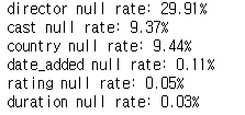 # 결측치 비율 : date_added(0.11%), rating(0.05%), duration(0.03%)