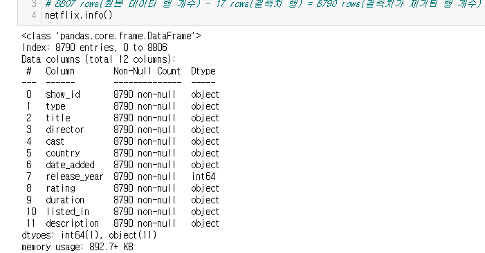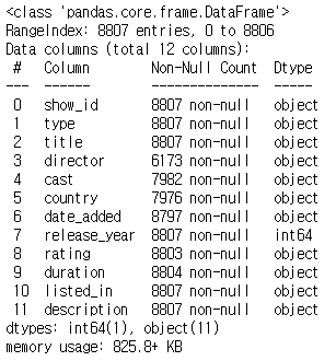 전체 행은 8807행으로 column별로 결측치와 데이터 타입을 확인할 수 있다. 위에서 살펴봤던 날짜 column인 date_added가 object 타입으로 되어 있어 to_datetime 전처리가 필요함을 확인했다.