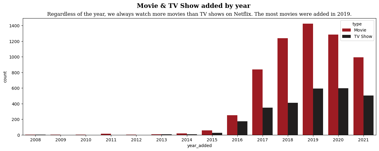 plt.title('Regardless of the year, we always watch more movies than TV shows on Netflix. The most movies were added in 2019.', fontfamily='serif', fontsize=12)