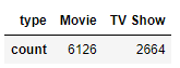 ratio = pd.DataFrame(netflix['type'].value_counts()).T