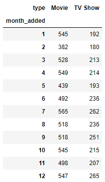netflix_month = netflix.groupby('month_added')['type'].value_counts().unstack()