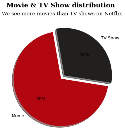plt.suptitle('Movie & TV Show distribution', fontfamily='serif', fontsize=15, fontweight='bold')