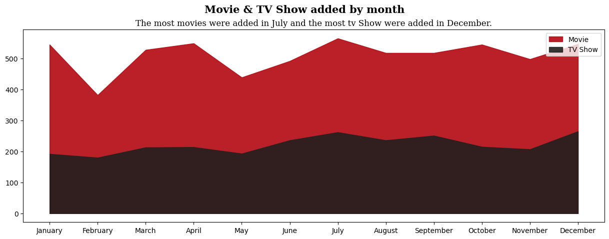 plt.suptitle('Movie & TV Show added by month', fontfamily='serif', fontsize=15, fontweight='bold')