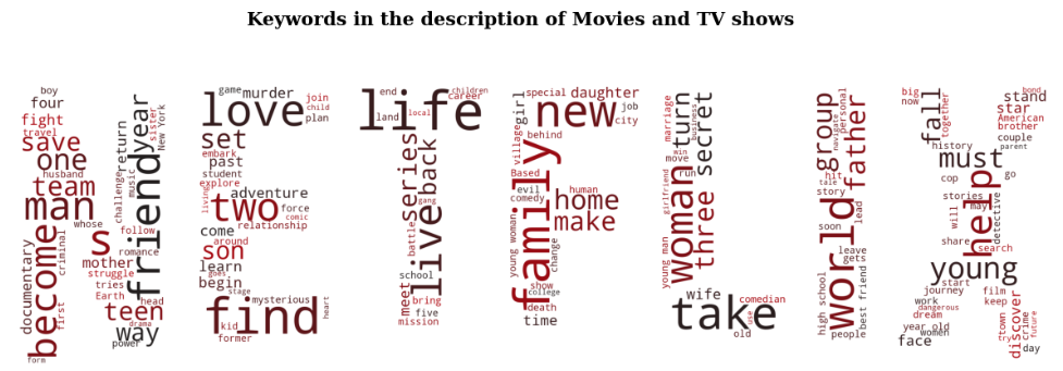 plt.suptitle('Keywords in the description of Movies and TV shows', fontweight='bold', fontfamily='serif', fontsize=15)